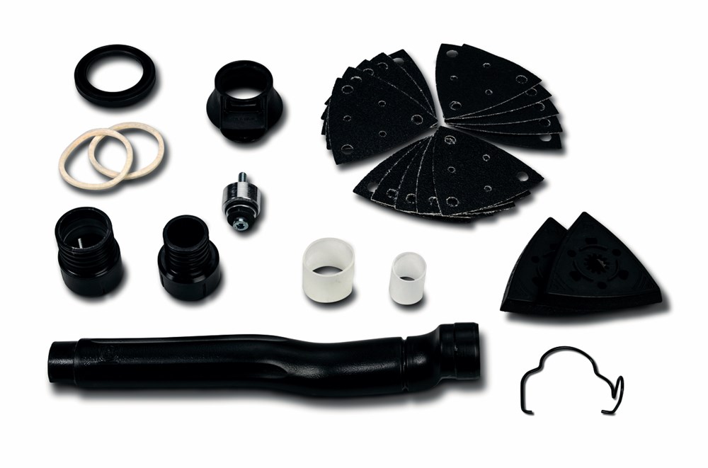 Voor alle schuur- en schraapwerkzaamheden met driehoekige schuurplaat en hardmetalen schraper, incl. 2 schuurplaten, geperforeerd; elk 5 schuurpapier, geperforeerd, korrel 60, 80, 120; 1 afzuigkap met aanzuigbuis; 2 slangmondstukken voor slangaansluiting ø 27 en 32 mm alsook 2 adapters voor het aansluiten op de gebruikelijkste huishoudsstofzuigers.