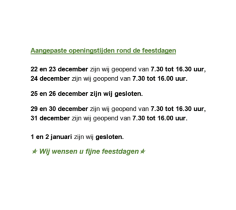Bekijk hierbij onze aangepaste openingstijden rond de feestdagen van 2025.